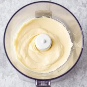 • From the top part of the food processor, slowly drip in the oil. Be careful not to rush this part. If you add the oil too quickly, the mayo could break.